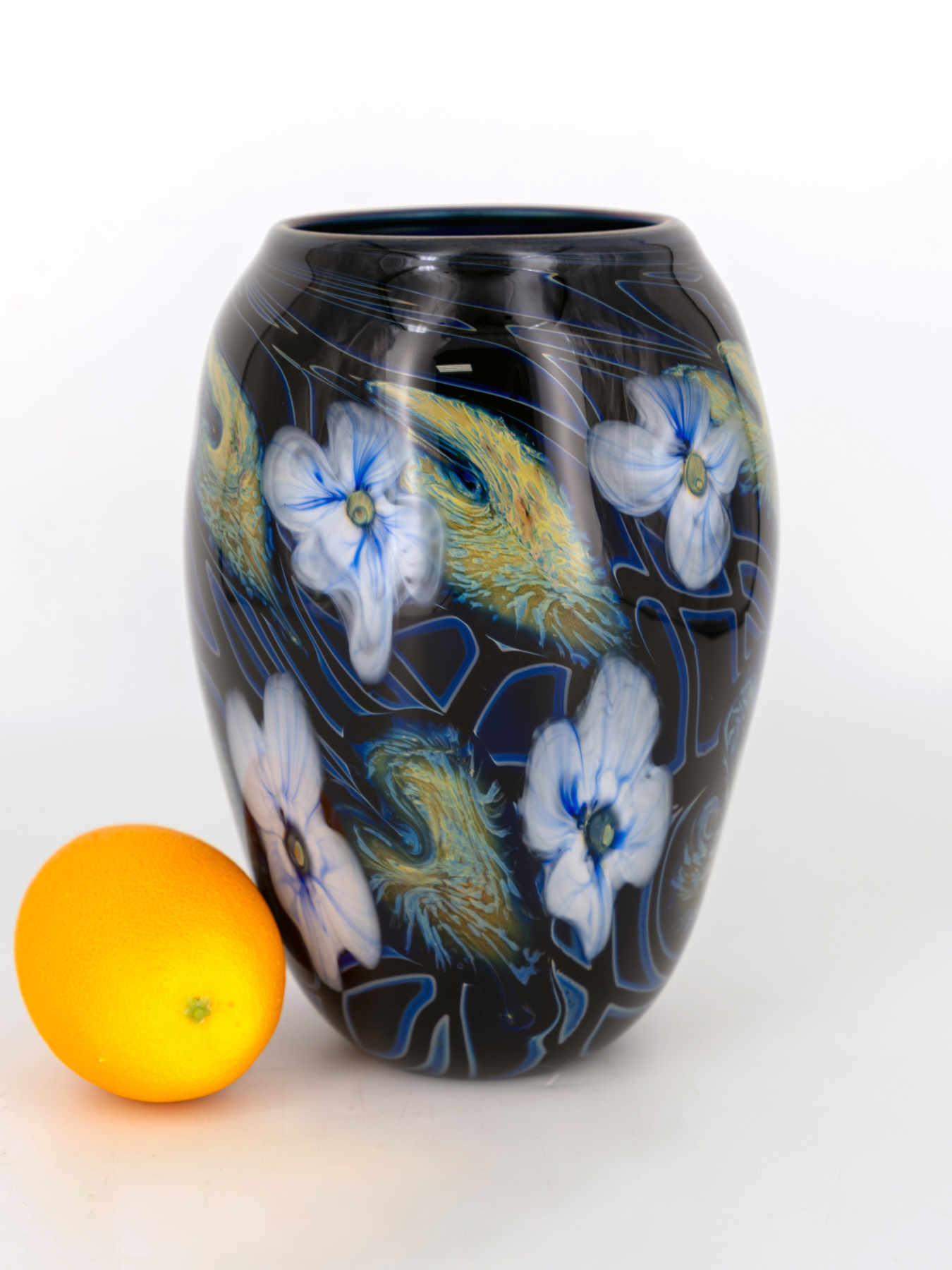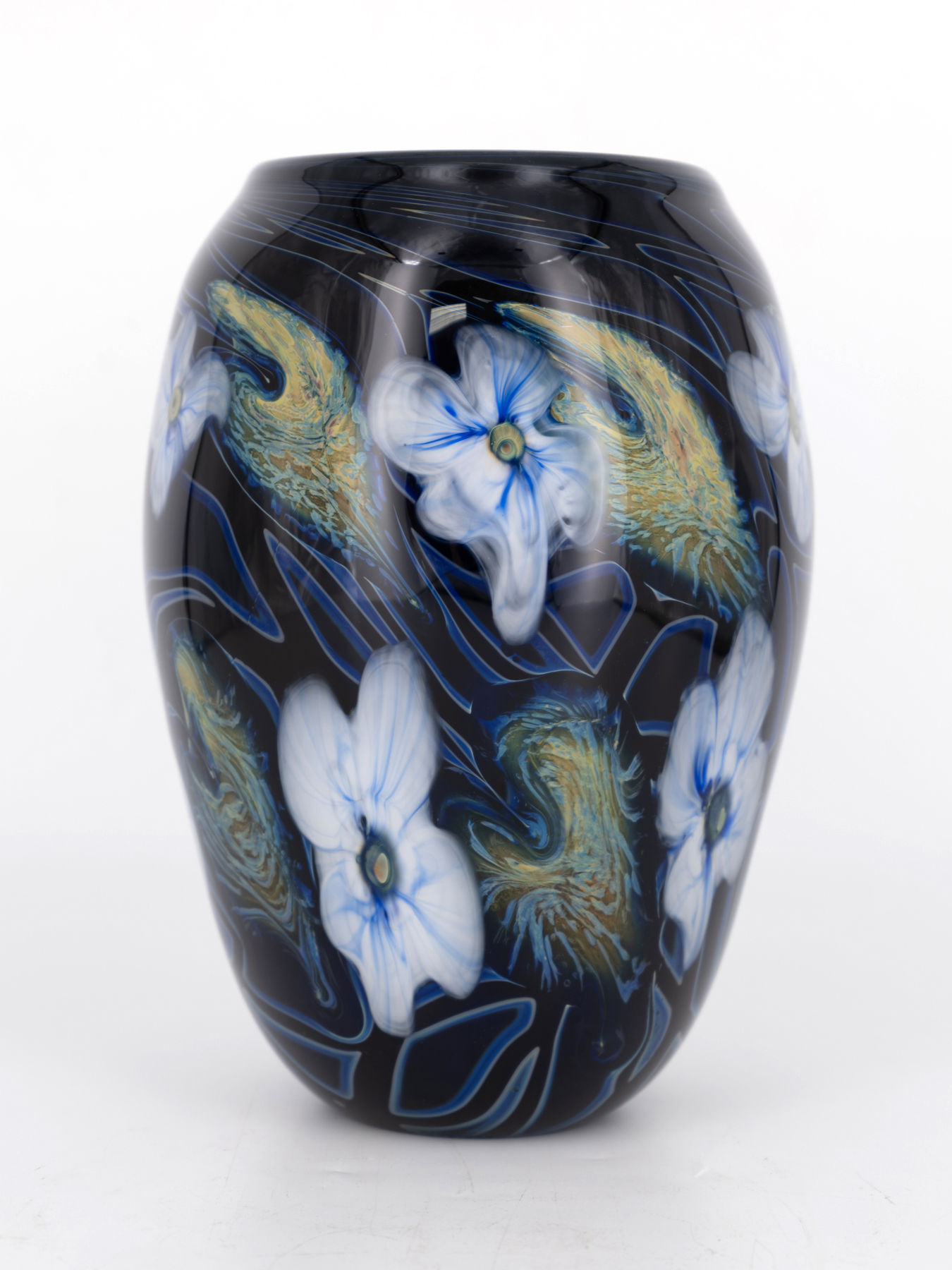 Cobalt Blue Multi Flora Vase with Leaf & Vine and White/Blue Blossoms, c.1989, 9.75" H. x 6.5" DIA.