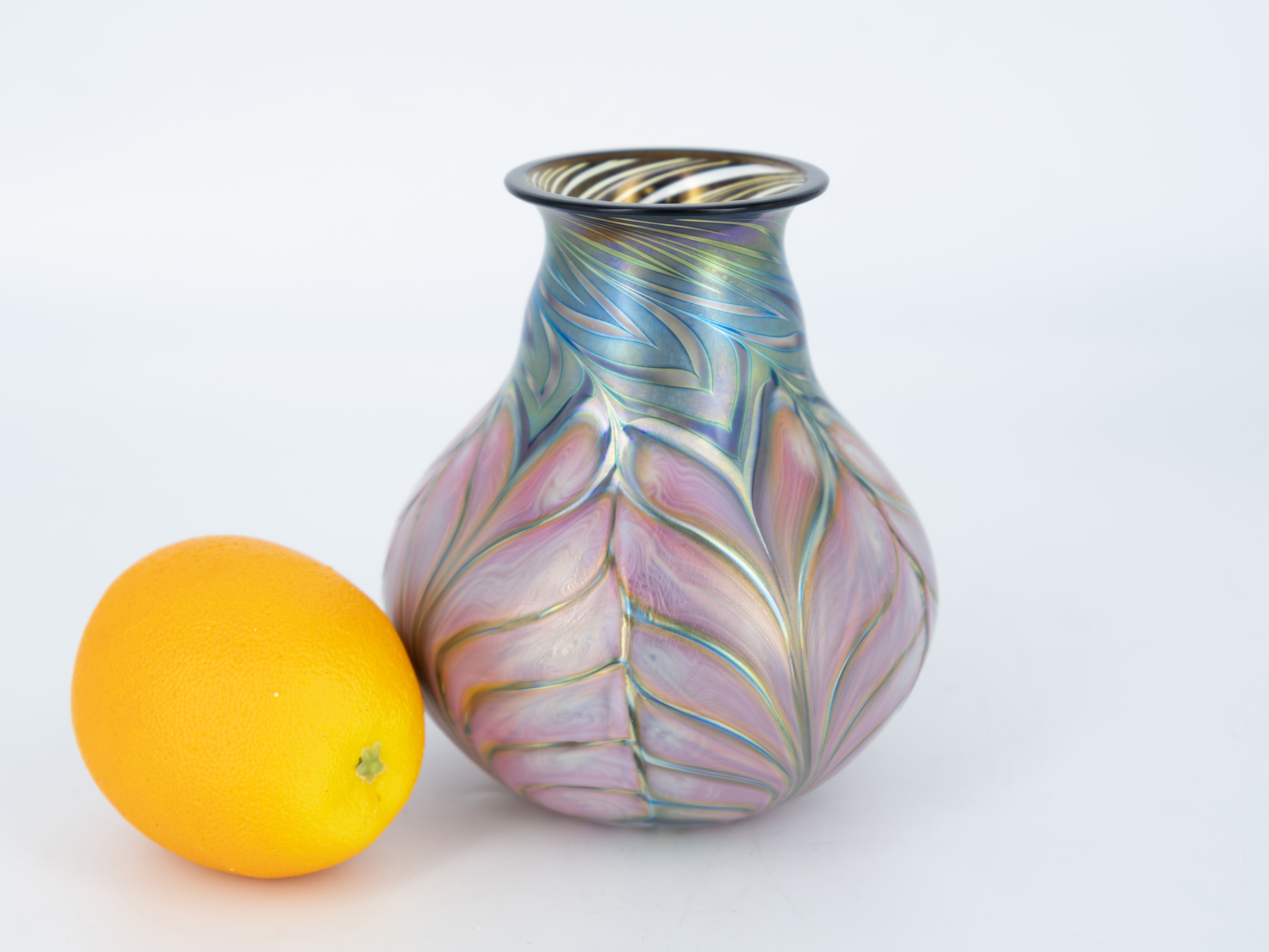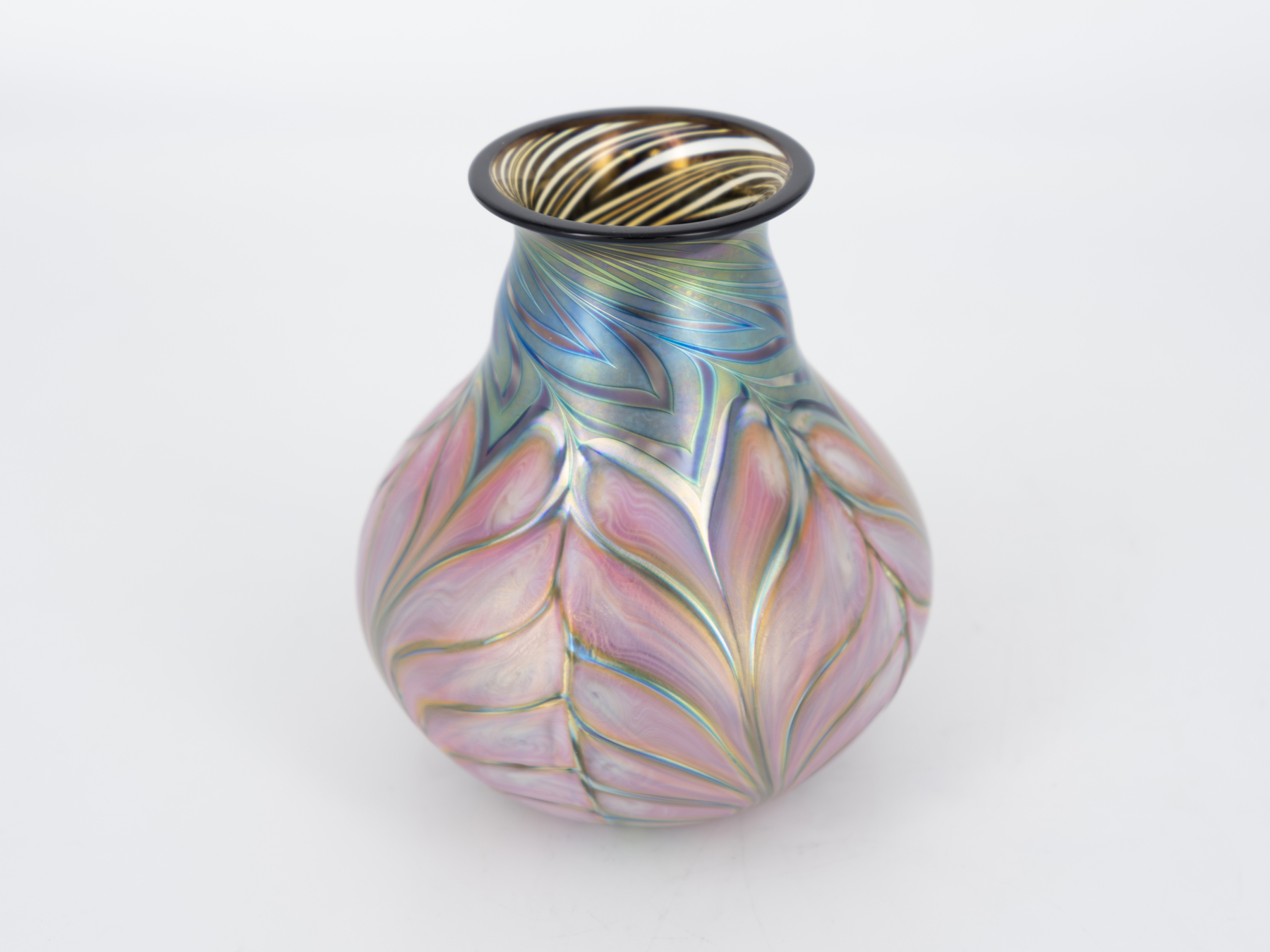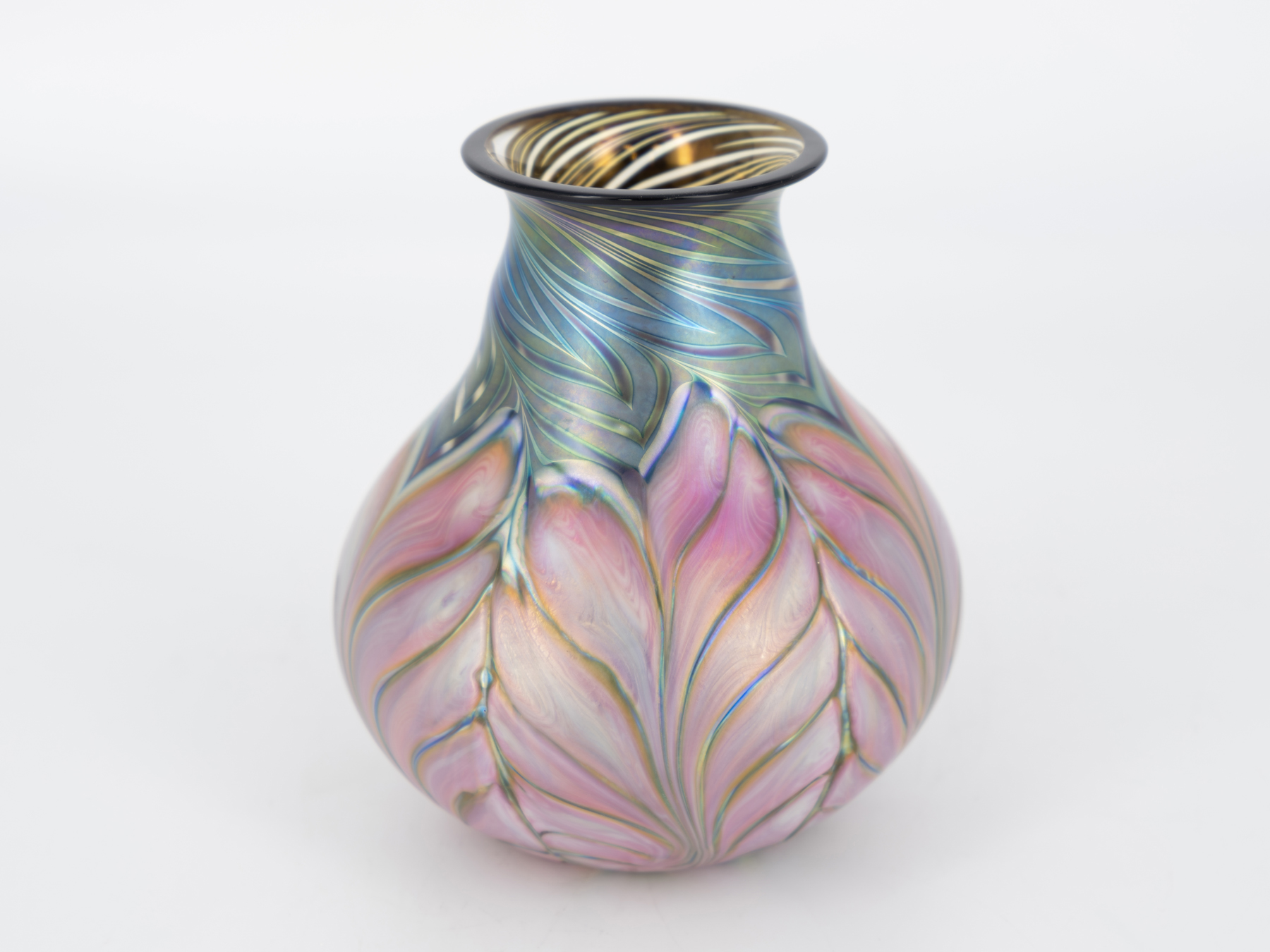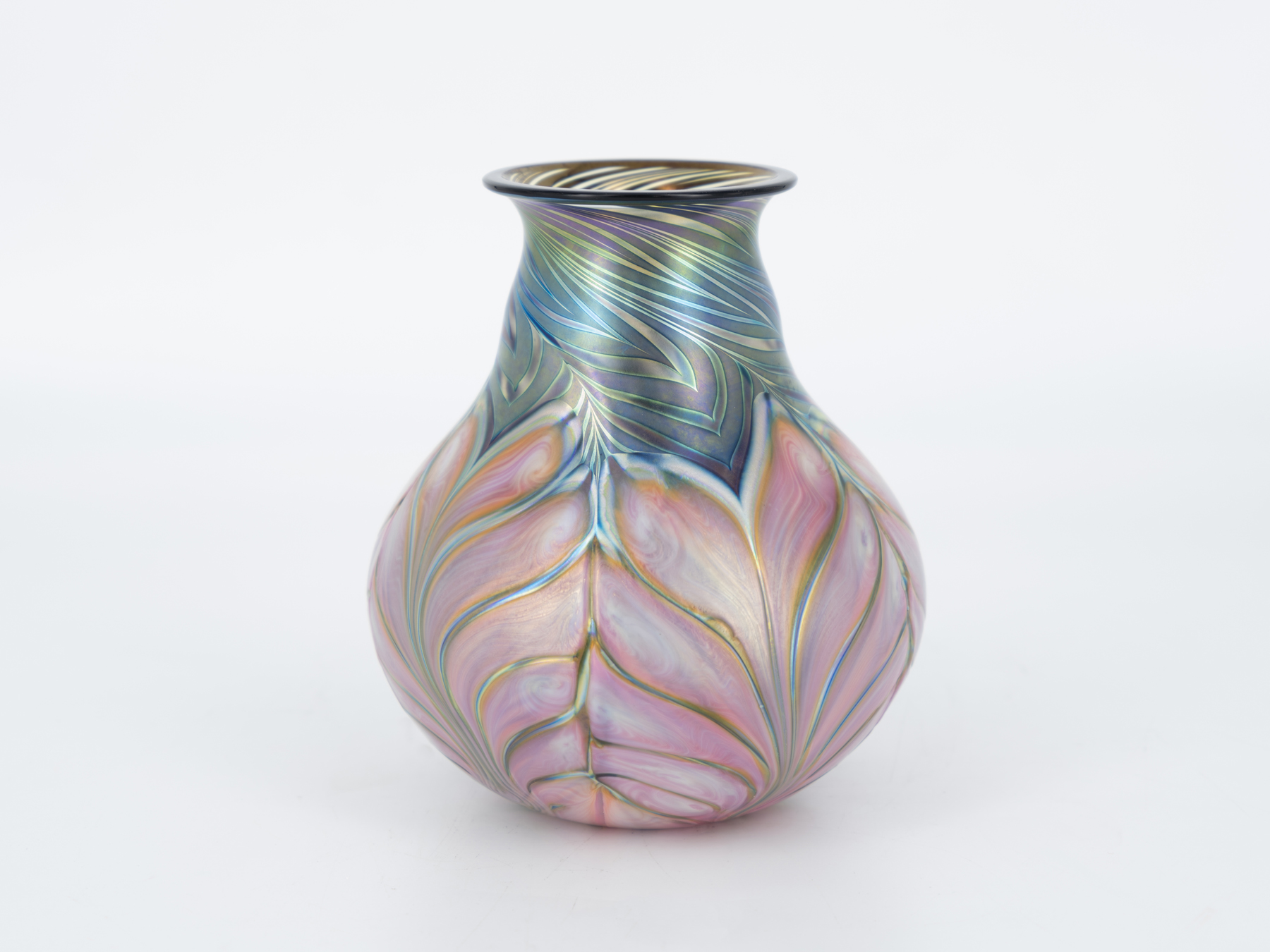 Iridescent Pulled Feather Vase, c.1989, 6" H. x 5.5" DIA