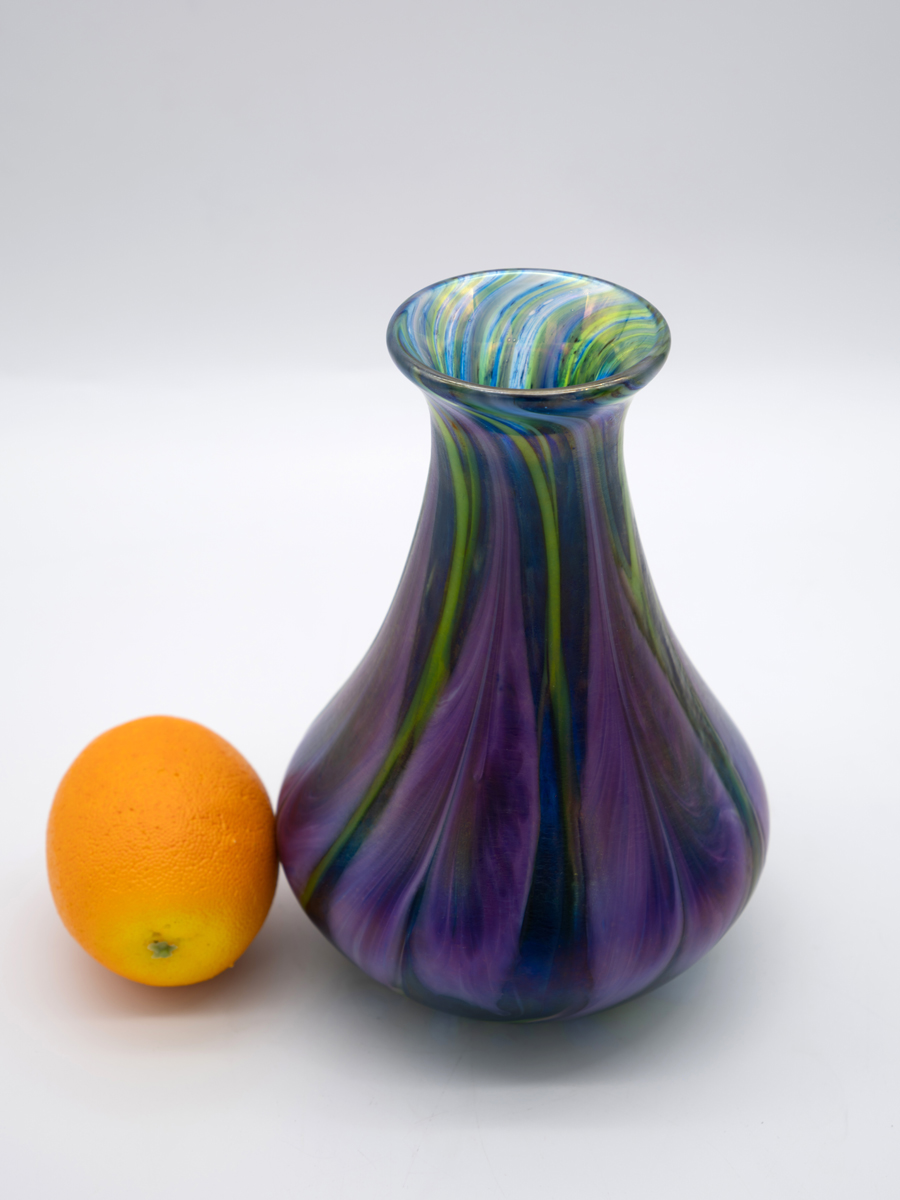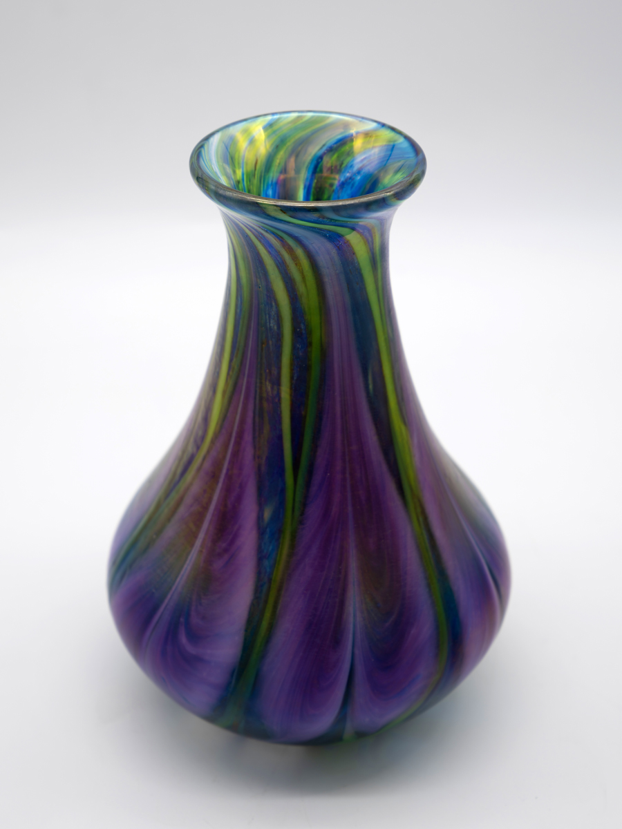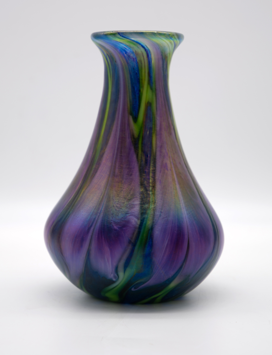 The impact on the eye here is stirring to the senses. Note the purple tones with their unique opalescence and the way they merge with the green tones, revealing the leaf structure within. The shape of this vase is accentuated as the artist allowed the glass to become a once in a lifetime work of art that can never be duplicated again.