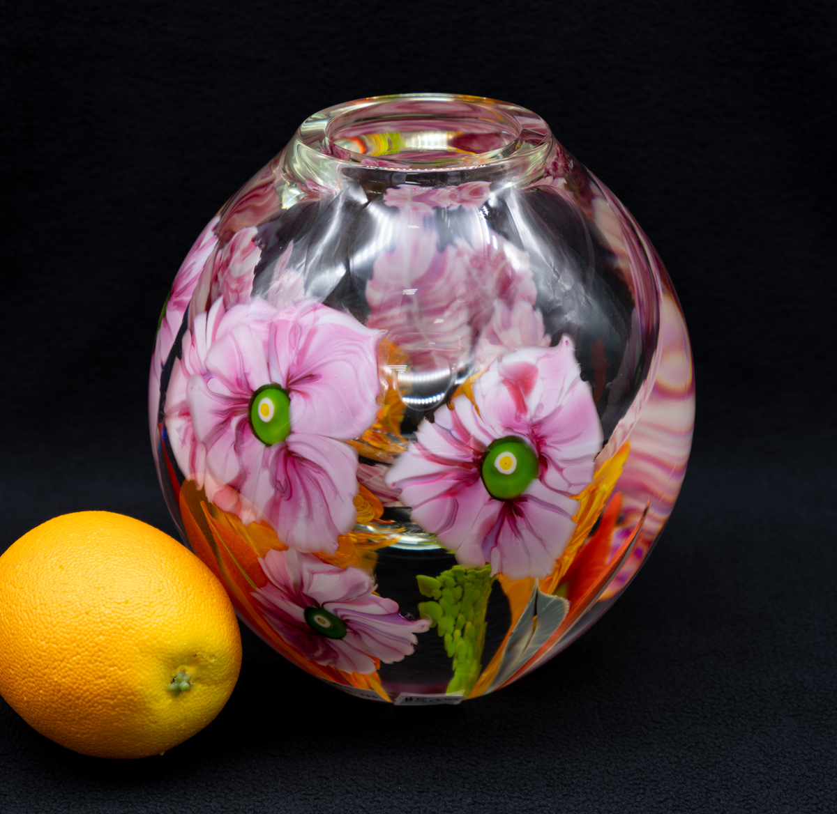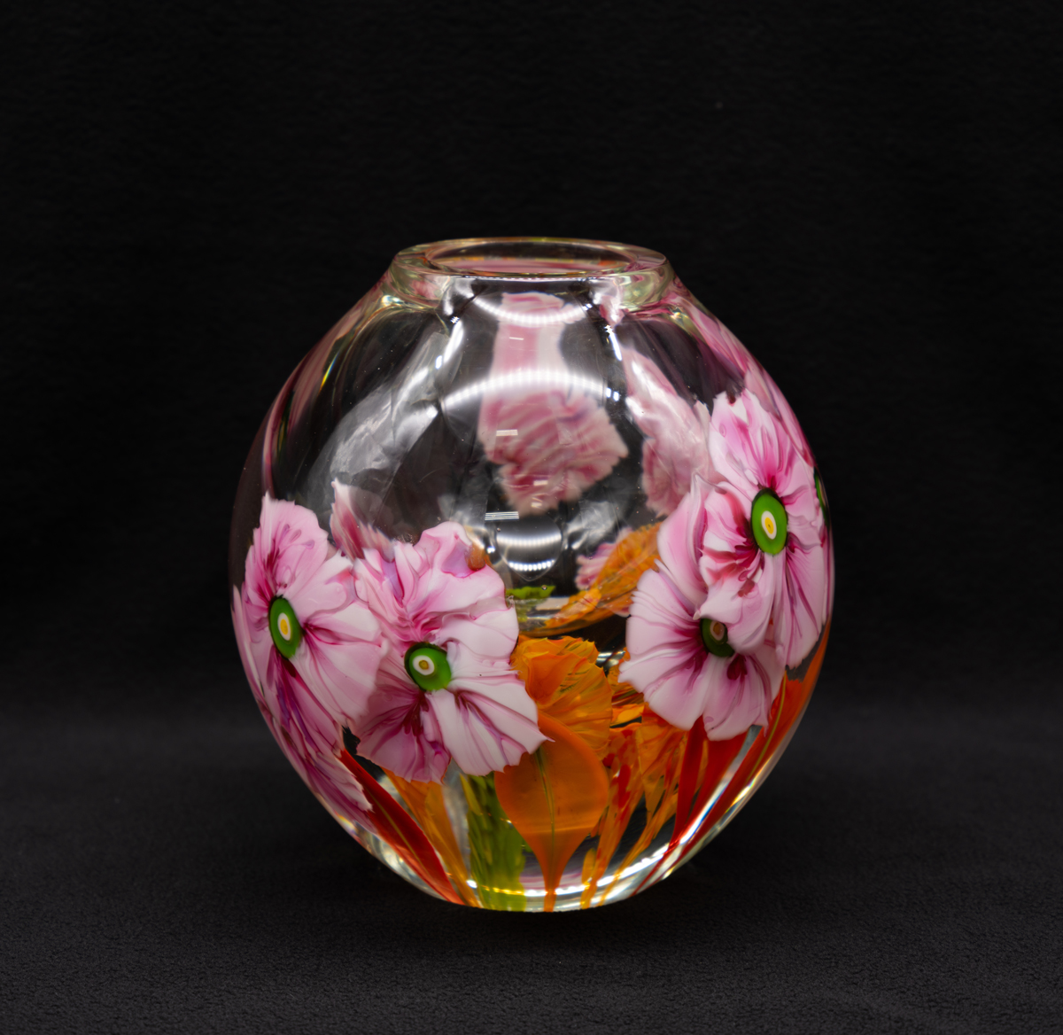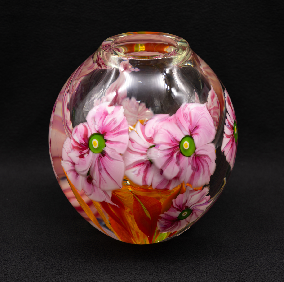 Magnum multi Floral Paperweight Vase with Variegated Pink Flowers and Faceted Lip | 7.5" (H) x 7" (W)