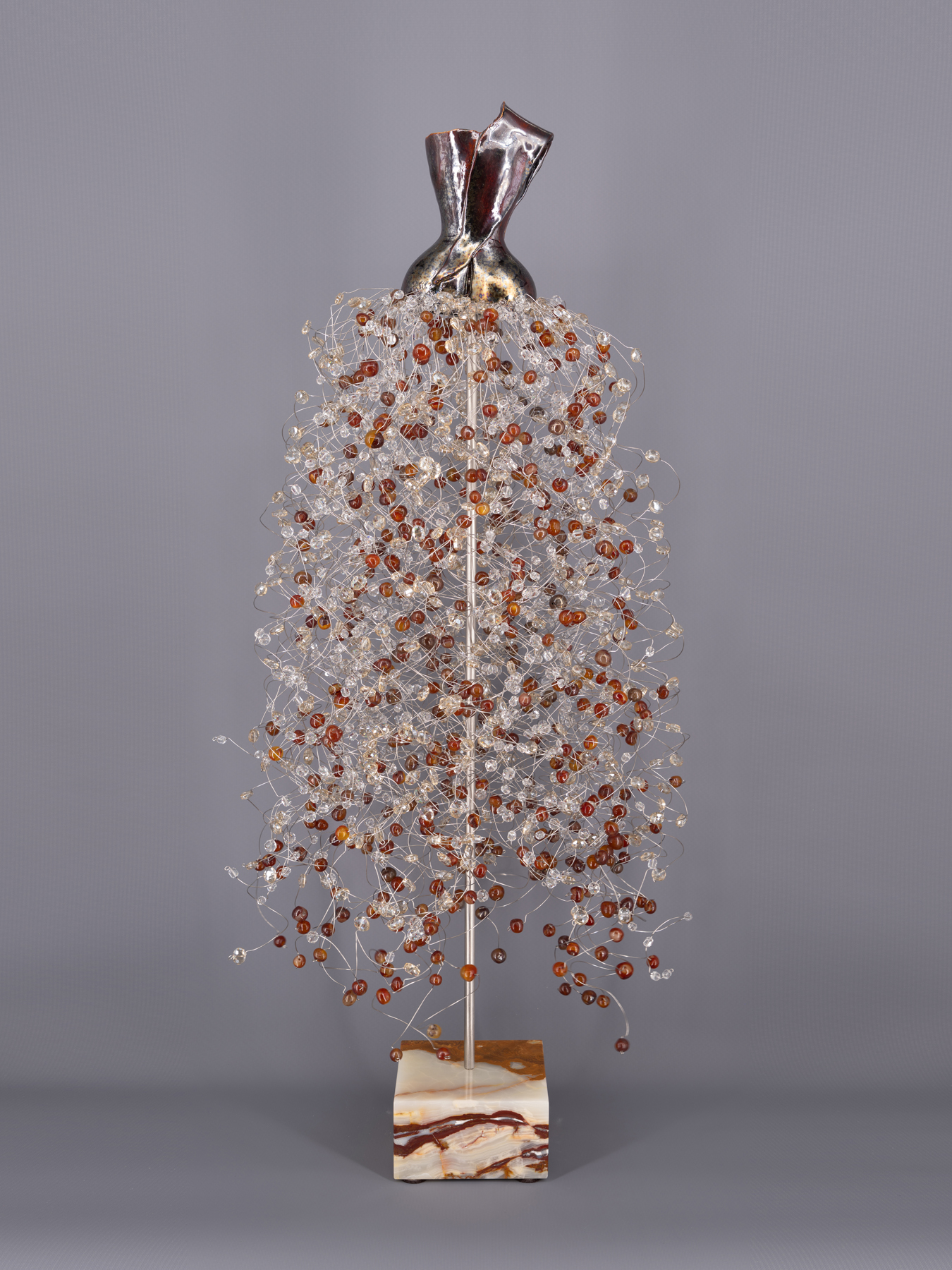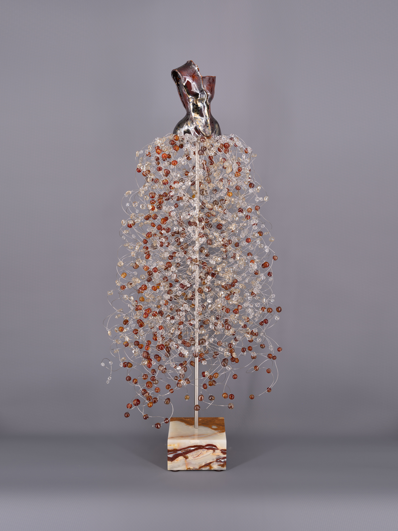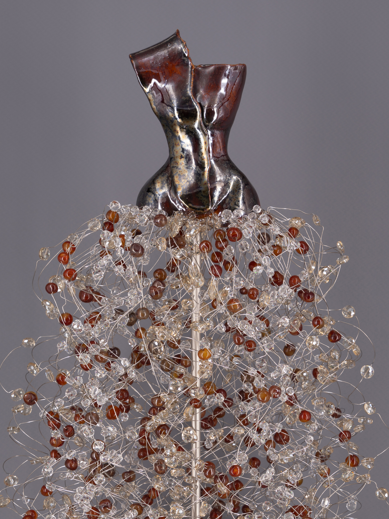Estella Fransbergen’s multimedia torsos emanate from the earliest traditions of Nature worship when Divine Woman/ Goddess/Mother/Daughter/Grandmother was extolled thorough art, altars, and song. From time immemorial, Her image has served to embody joy, to symbolize the essential role that pleasure must play in any pious life, and to catalyze a worshiper’s innate capacity to see and feel with compassion and intensity. Fransbergen adds to this lineage of devotion her personal expression of the Divine Female as the universal embodiment of beauty intrinsically incorporated with the power of Nature. Alive in her pieces are visions of an earth in which sacred and miraculous rivers flow, holy forests and groves flourish, reservoirs of life blossom, and gnarled trees brim with vitality, holding the power to heal and grow. Consider the power of the rubies, emeralds, quartz crystals, and amber used in the pieces: they have been forming within the earth for millions of years, compressing their energy, each at a different frequency, generating the force to purify, protect, strengthen, balance, and bless. It takes time to visually and spiritually absorb the many dimensions of these haute couture figures born out of earth and fire.