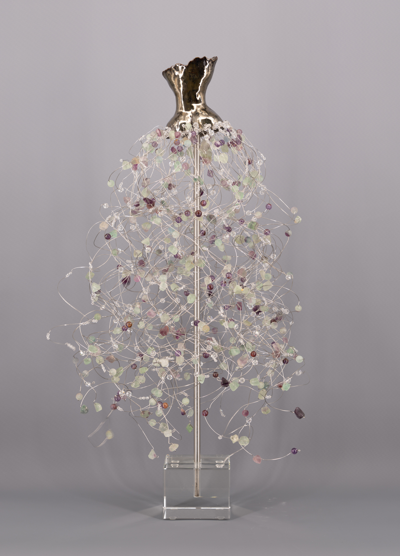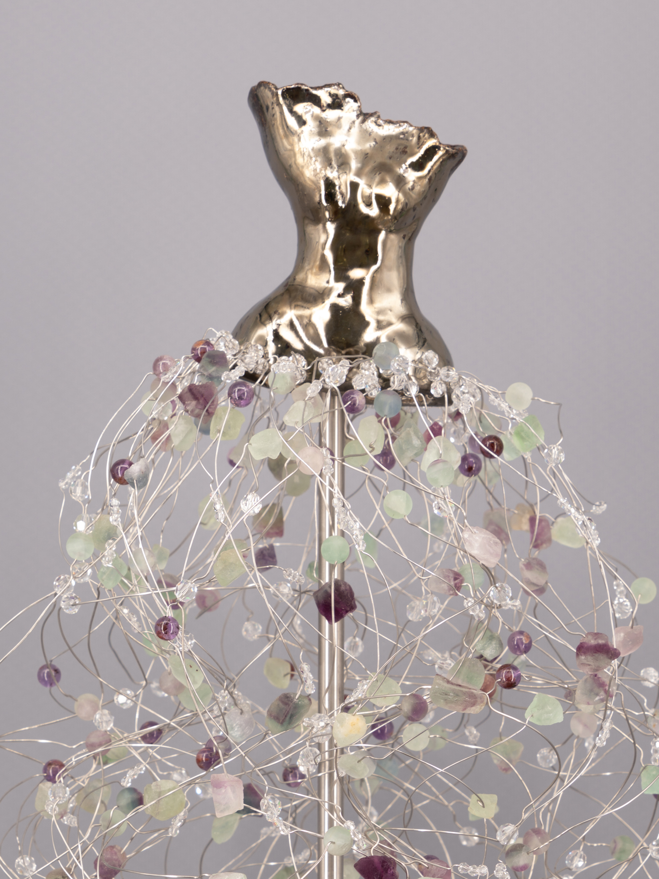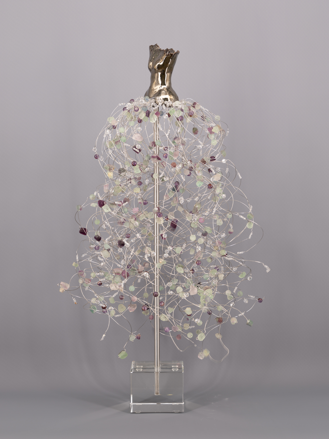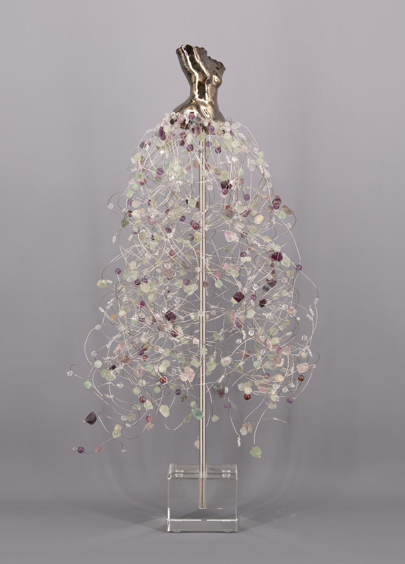 High-Fired Clay Torso with a Fluorite & Crystal Skirt on a Crystal Base.