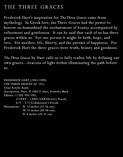 Frederick Hart's legacy is diverse and wide spread, throughout his career he worked in stone, bronze, marble and pioneered the use of acrylics in figurative sculpture, a technique he called "sculpting with light". He was an inventive revolutionary; his works are physical and sensuous, yet spiritual; direct, graceful and subtle. He is survived by Lindy Hart and they are the parents of two sons, Lain and Alexander . . . And he is survived by his art which lives on, spreading ethereal, vibrant beauty throughout the world.
