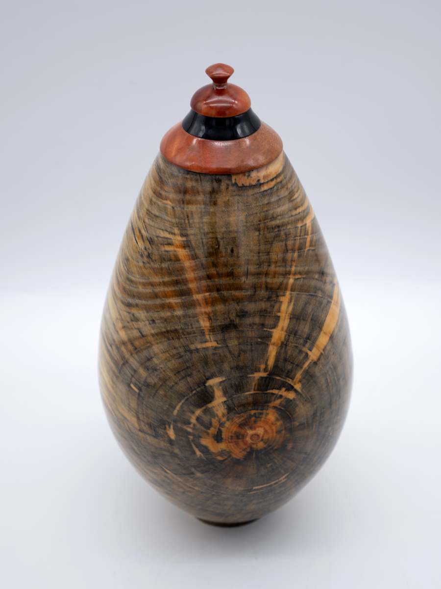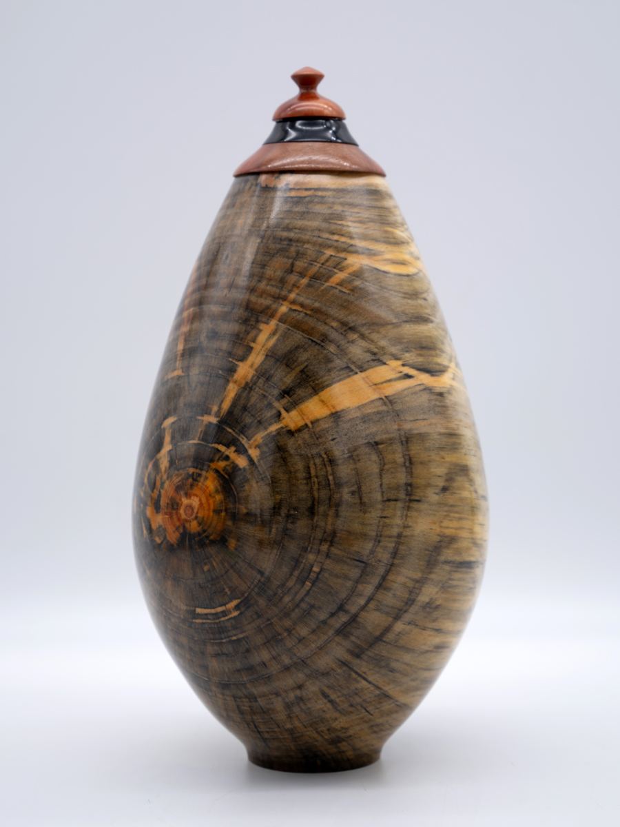 Star Burst, Large Norfolk Island Pine Hollow Form with Red Eucalyptus and Ebony Collar and Red Eucalyptus Top, 13" H x 6" D