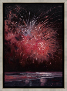 Radiant bursts of crimson and silver ignite the coastal night in this expressive composition. With painterly energy and glowing contrast, Cutter transforms a moment of festivity into a meditation on wonder—beauty suspended in air and mirrored in the quiet rhythm of the waves.