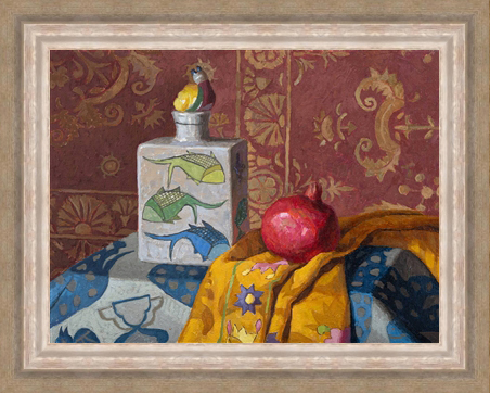 During this time of study, figurative work was the predominant subject, and her comfort with that genre is seen in her many portraits and figurative studies in ink wash.  The idea of still life followed later and is now a substantial and significant avenue in her oeuvre. Her current series of still life creations were heavily influenced by a three-day trip to Venice last year to celebrate her husband’s birthday (acclaimed Russian Master, Daud Akhriev).  These originals emanate from the perfect setting for an artist.  Lit by the Spanish sun via a skylight installed by her devoted Daud, these paintings are illuminated and influenced by a far reaching and arching beam of natural light which travels throughout the course of the day circuitously around her studio.   There is a ledge set into one of those pale white washed walls upon which Melissa assembles her beloved treasure horde into the compositional excellence of her paintings.  These objects repeat themselves in a singular fascination for those who love playfulness and a good story. These little pieces of pleasure are, for Melissa, part of her days in the studio.  They move, change, and manifest the memories of the moments they were joyfully acquired ...the studio is an intricate part of their beautiful life in Spain.
