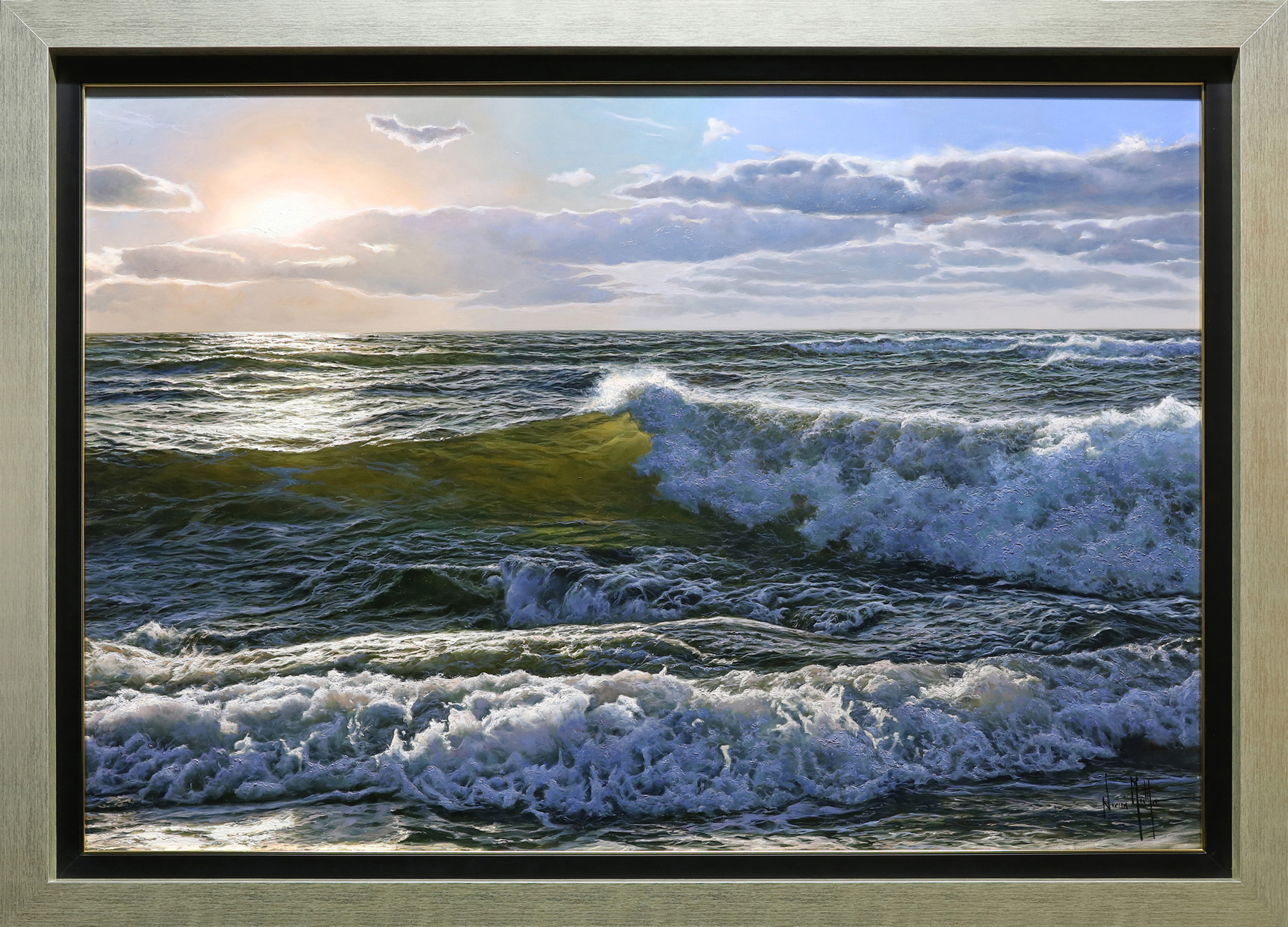 In finishing his economic studies, he returned to Alcoy (1994) and began to paint along with his father and brother, also an artist, with whom he shared a studio. It was then that he centered all of his effort and knowledge on painting, now based exclusively on the ocean and the sea as the main subject, as well as absorbing the knowledge and experience that his father offered him. After this stage in his life, Navarro established his own studio (1996), exclusively dedicating himself to perfect his technique, incessantly looking for the realism in his paintings. He enjoyed spending a lot of time alone in his studio with his only company being Bach, his favorite Baroque composer, and searching among his files. A huge classical music lover, he feels a special sensitivity towards baroque music, which always accompanies him throughout most of the day. Navarro tries to show the spectator a window that shows the beauty of the sea, as he perceives it; in addition he confesses that his works reflect to a great extent his frame of mind.