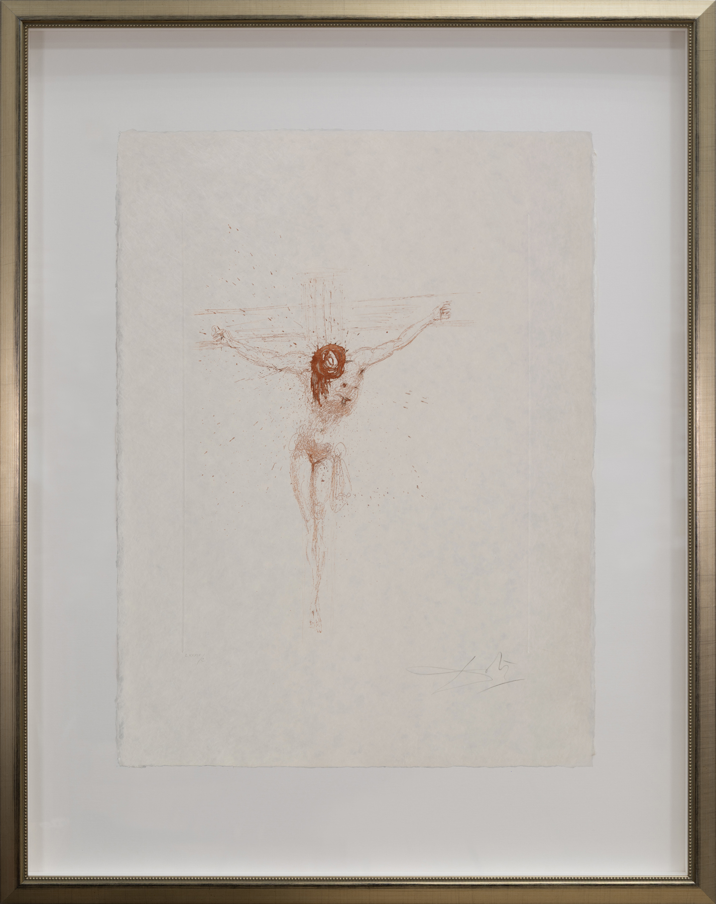 Dalí’s The Christ in Sanguine features a powerful and emotionally charged rendering of Jesus Christ, captured not with overt realism, but with the artist's expressive, gestural linework and surrealist energy. Created in sanguine, a reddish-brown tone historically used in Renaissance drawings. Dalí strips away excess detail, focusing instead on the essence of Christ’s individuality, his humanity, and sacrifice. The use of sanguine lends the figure both warmth and intensity, a departure from more traditional sacred depictions. Part of The Argillet Collection, one of the most respected bodies of Dalí’s print work, which remains in high demand among collectors. Hand-signed Dalí etchings from this series are increasingly rare and valued not only for their artistic merit but also for their authenticity and provenance.