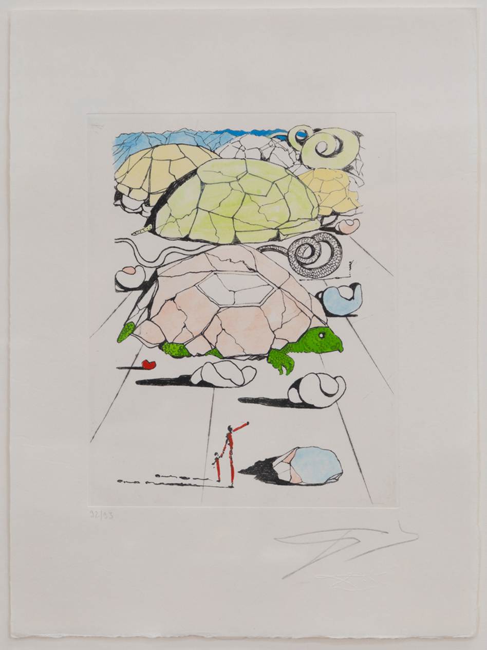 In The Turtle Mountains Dali has imagined gigantic, antediluvian animals amidst Yin and Yang-like objects scattered across the landscape. Whether you're drawn to surrealism, or simply seeking a rare and conversation-starting acquisition, this etching is a powerful addition to any fine art collection.