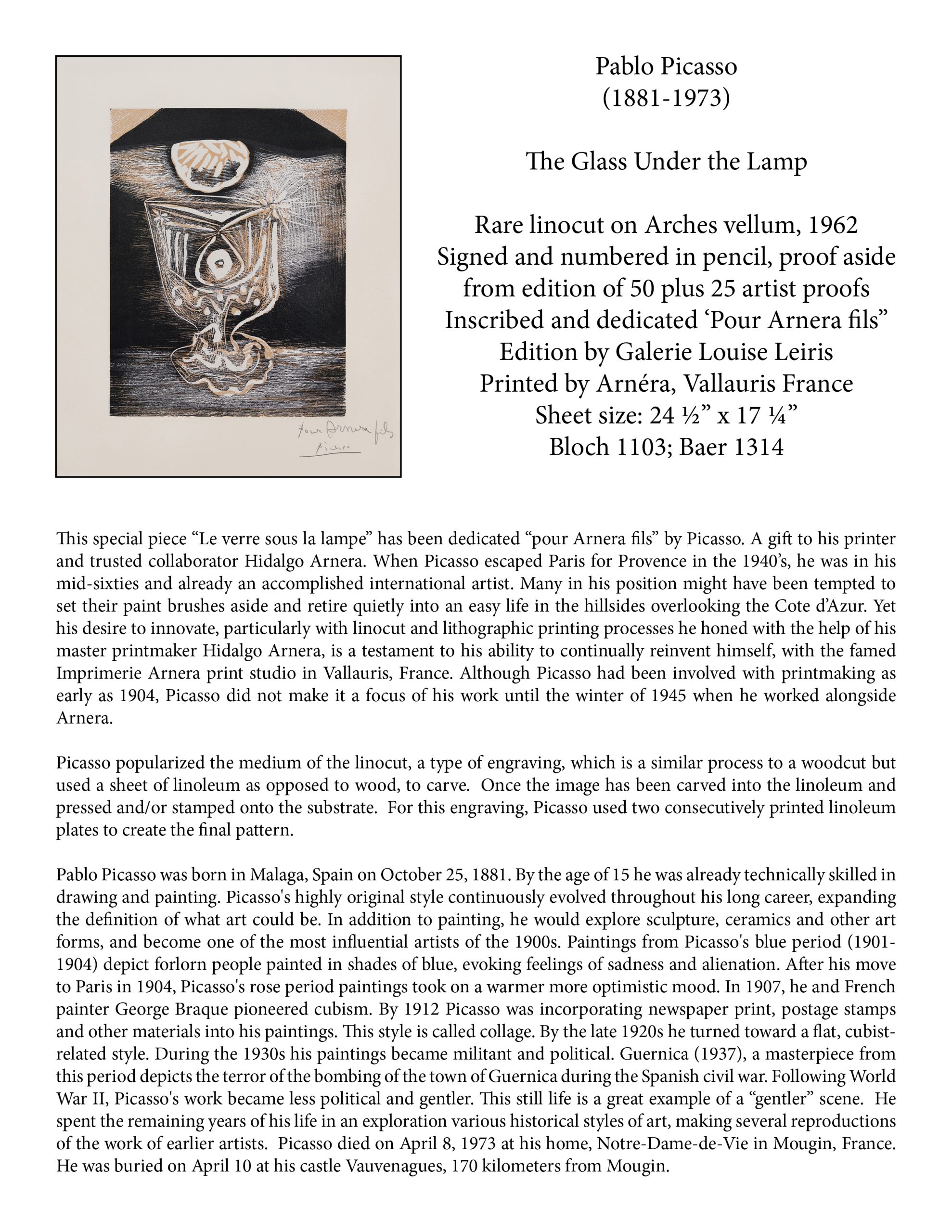 Born in Malaga, Spain in 1881, Pablo Picasso is universally regarded as one of the most influential artists of the 20th century. His stature ranged from painter, sculptor, printmaker, ceramicist, stage designer to poet and playwright, living most of his life in France. While most well-known for co-founding the Cubist movement, the invention of constructed sculpture and co-inventing collage, Picasso also developed a wide variety of artistic styles. After his formative years of painting in a naturalistic manner, he experimented with different theories, techniques, and ideas. Picasso was extraordinarily prolific throughout the course of his long life of 91 years and along with rival, Henri Matisse, is viewed as a leader of modern art as we know it.