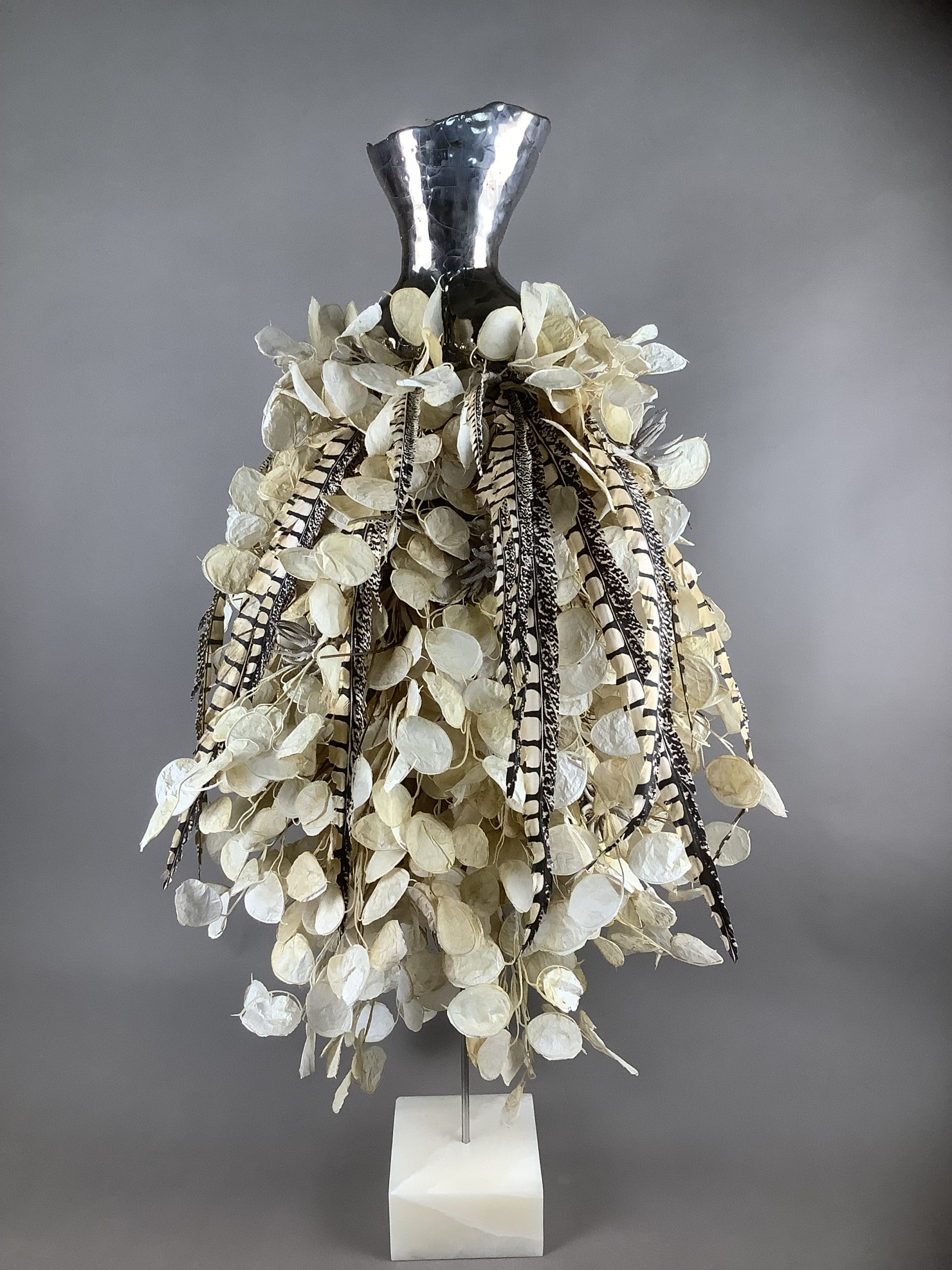 In Celebration of Mother Nature . . . I “dress” the naked form of the torso to represent nature using feathers, branches, leaves, and gemstones. I use semi-precious and rare stones, formed over millions of years. Ancient science tells us that each stone has a symbolic meaning and our eyes detect the unique beauty of what lies within each.