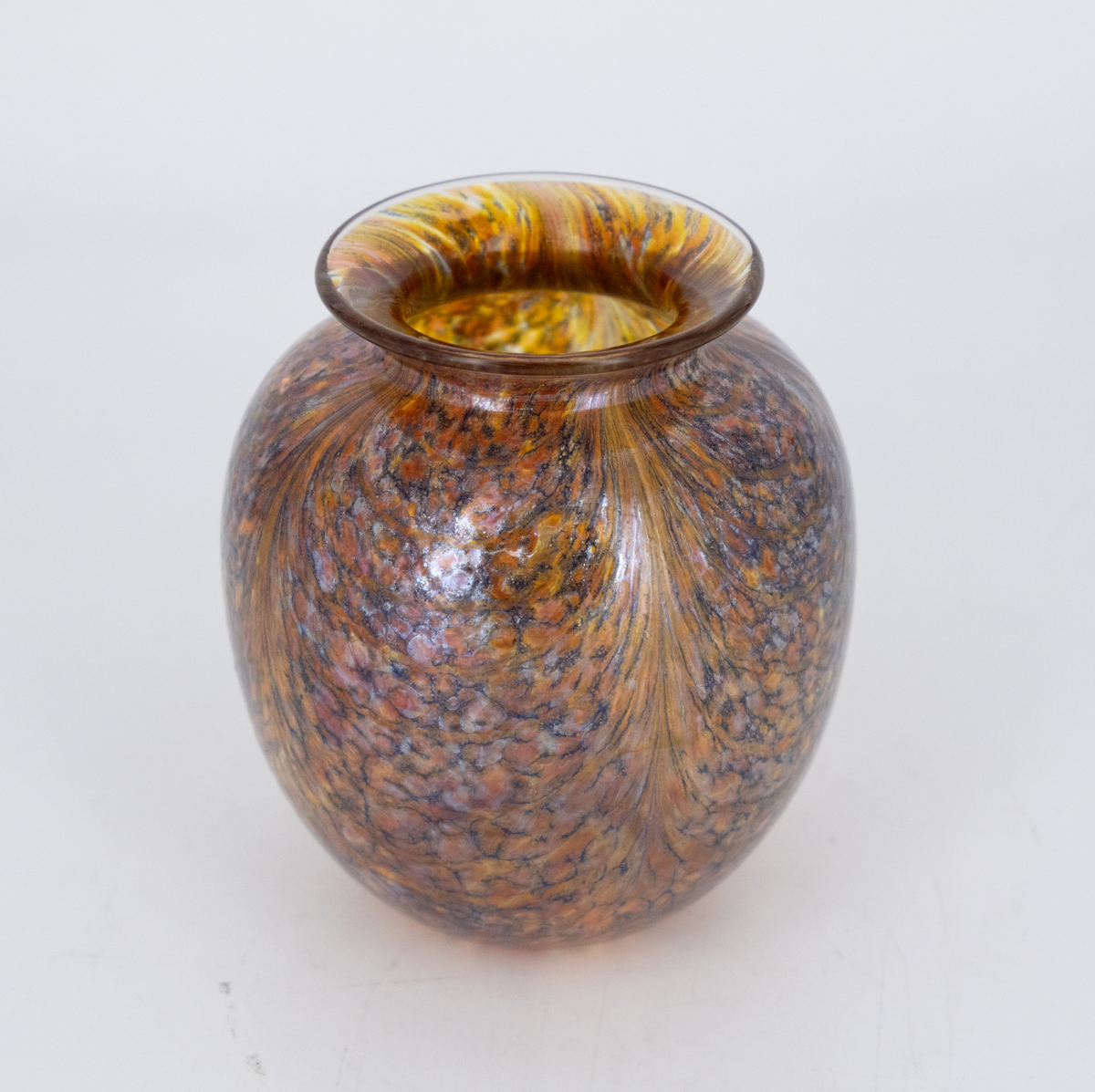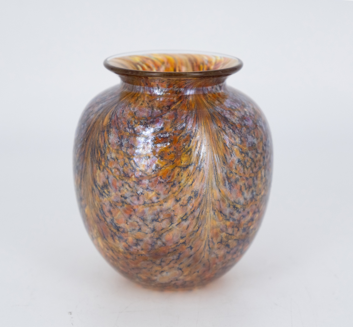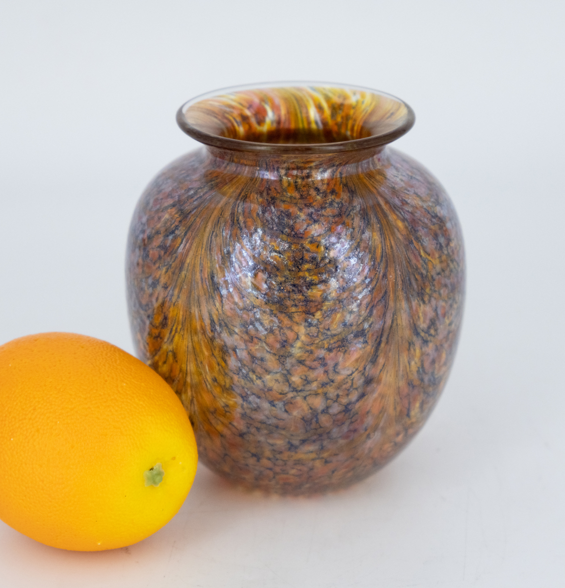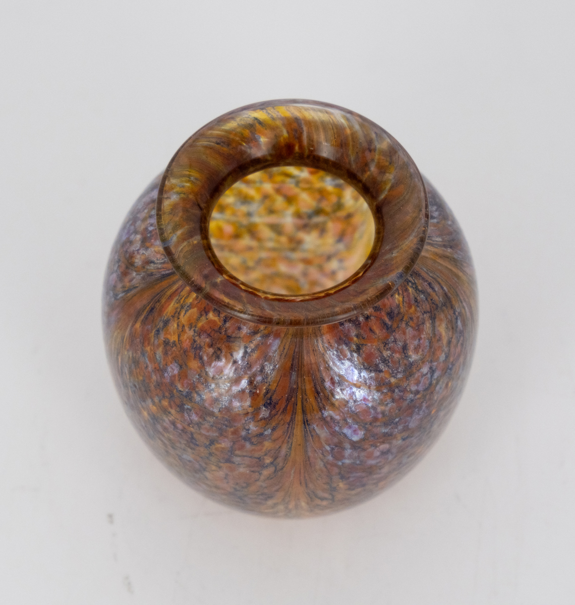 Amber Rolled Ruby Cypriot Vase with Fold Aurene Decor, 5.5" (H) x 5 (D)