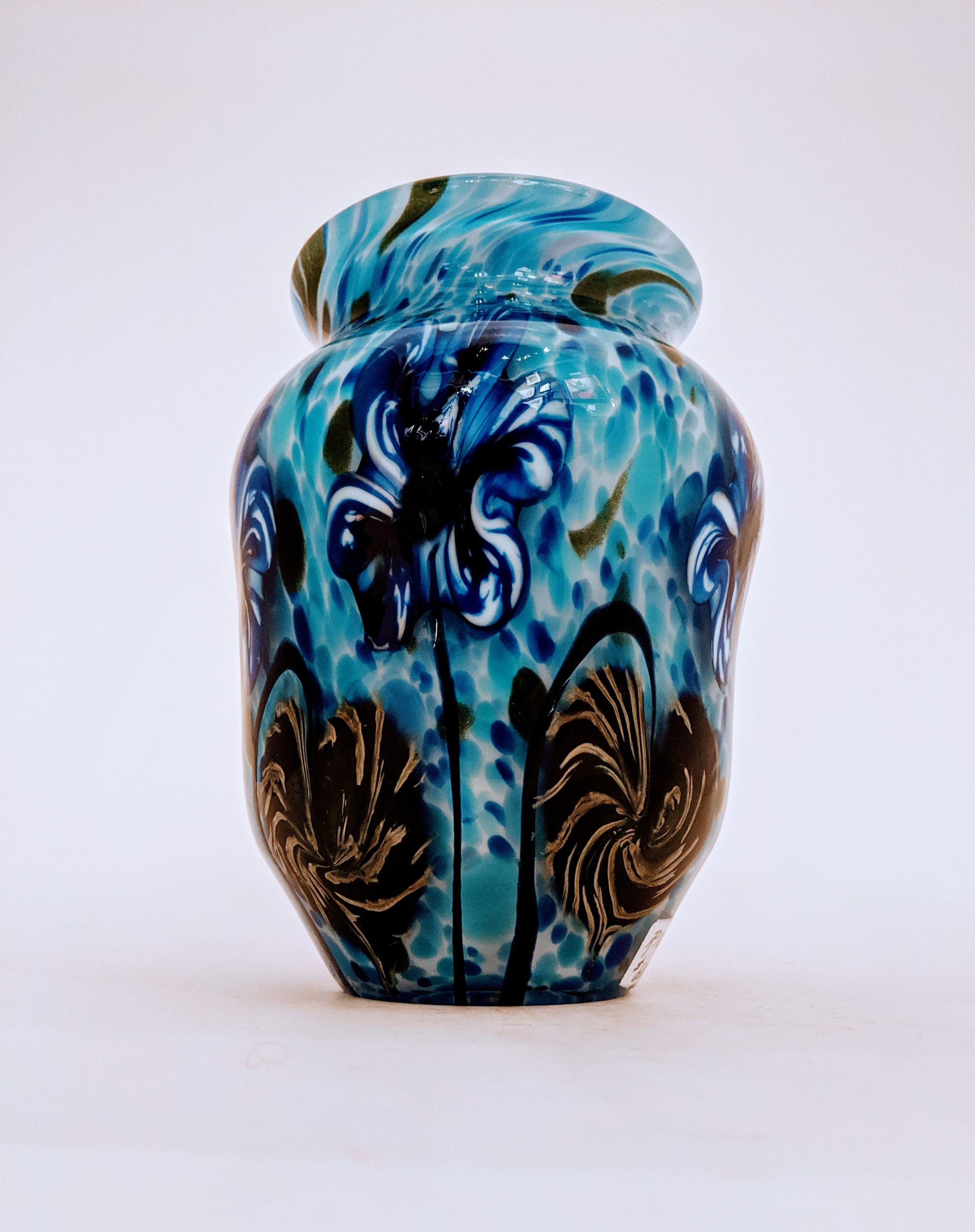 Opal Vase, Copper Blue Cypriot with Cobalt Blue Triple Heart Blossoms | 7.5"H x 5.5"W | Hand Blown Art Glass | R-161