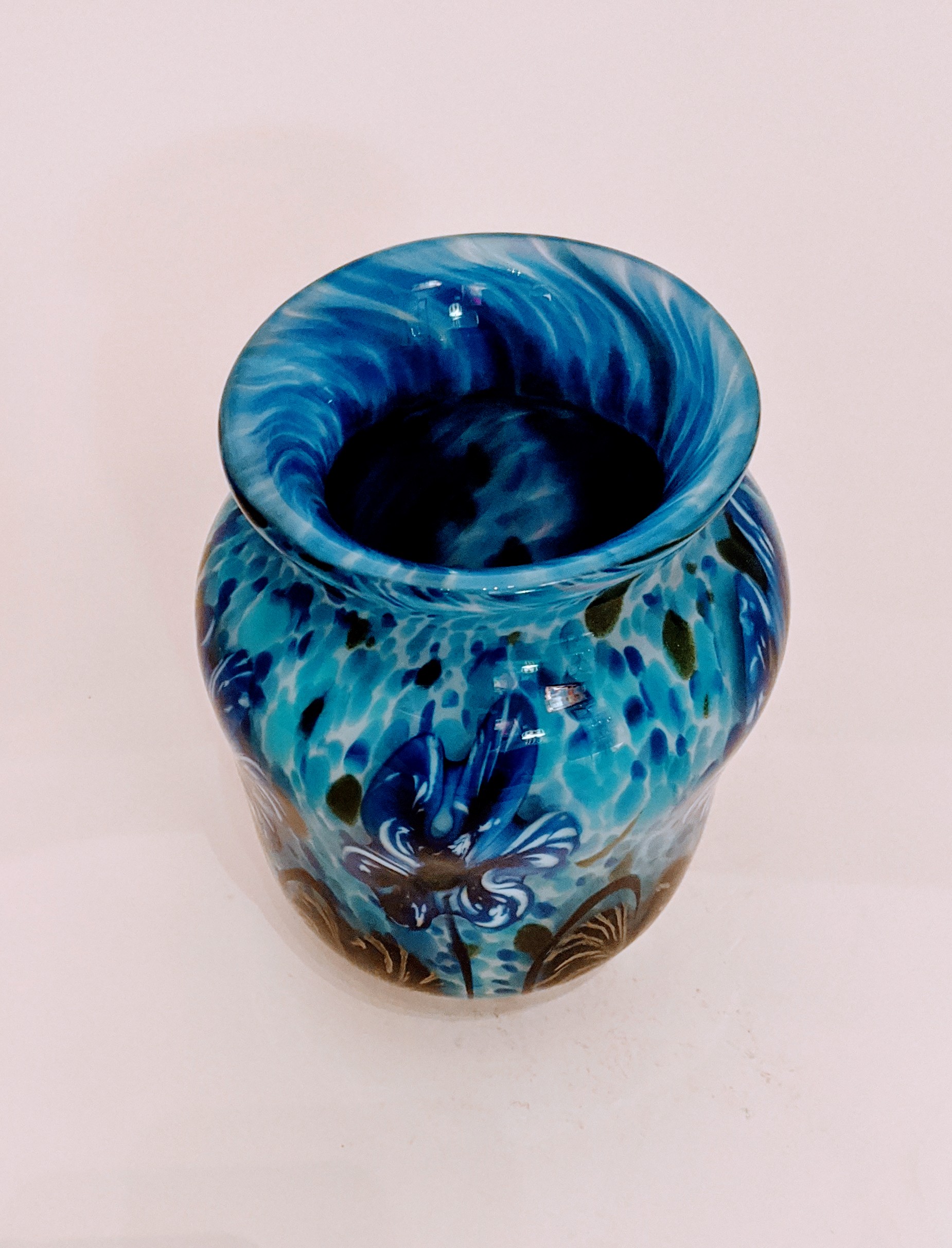 When viewed from the top, an elegant swirling effect of liquid is a pleasant surprise. From straight on… a magnificent example of what an artist can do with a cypriot technique in glass making. A spectacular and sterling work of art!