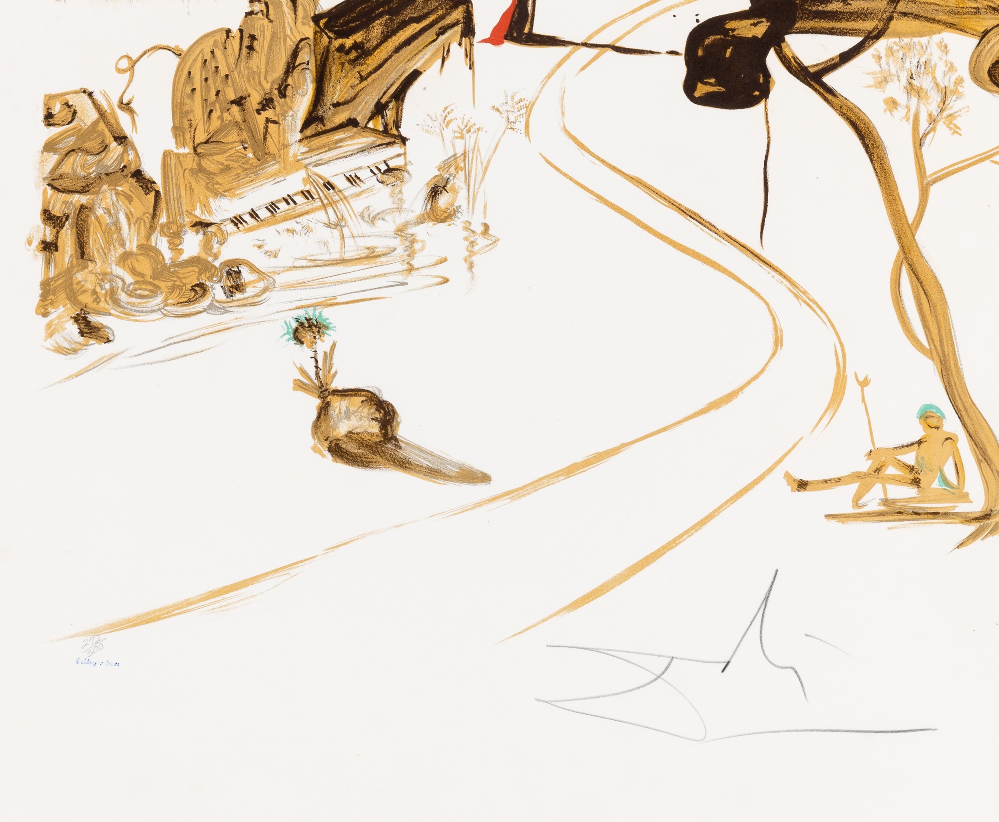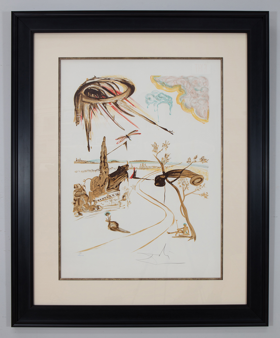 Dali, like his predecessor Bosch, has always been an explorer, a voyager into the barely charted regions of man's – and specifically his own – psyche. In this haunting print a meandering road invites the viewer into these regions, leading him through a strange landscape toward a hazy and barely defined horizon. Along the way he encounters strange objects and inhabitants: a rock which is a head, a stalagmite man riding a horse whose legs become a piano which in turn is the source of a spring. This land is ruled by a causality unlike that or a familiar daytime world in which we live. Nevertheless, strange as it may seem at a first glance, this land will evoke a faint and haunted recognition from most of us.