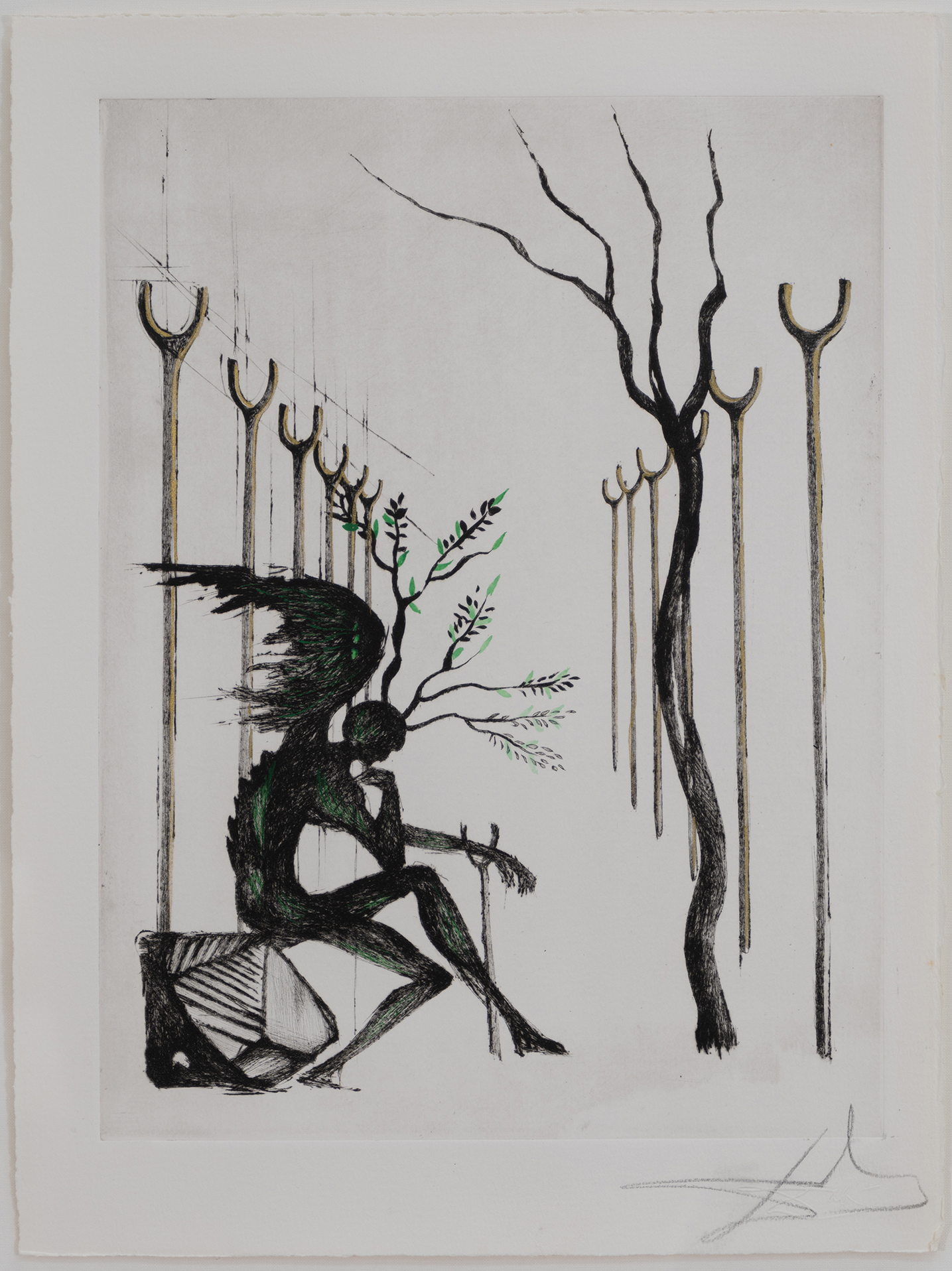The artist worked extensively in the graphic arts, producing many etchings and lithographs. While his early work in printmaking is equal in quality to his important paintings, as he grew older he would sell the rights to images but not be involved in the print production itself. In addition, a large number of fakes were produced in the 1980s and 1990s, thus further confusing the Dalí print market.
